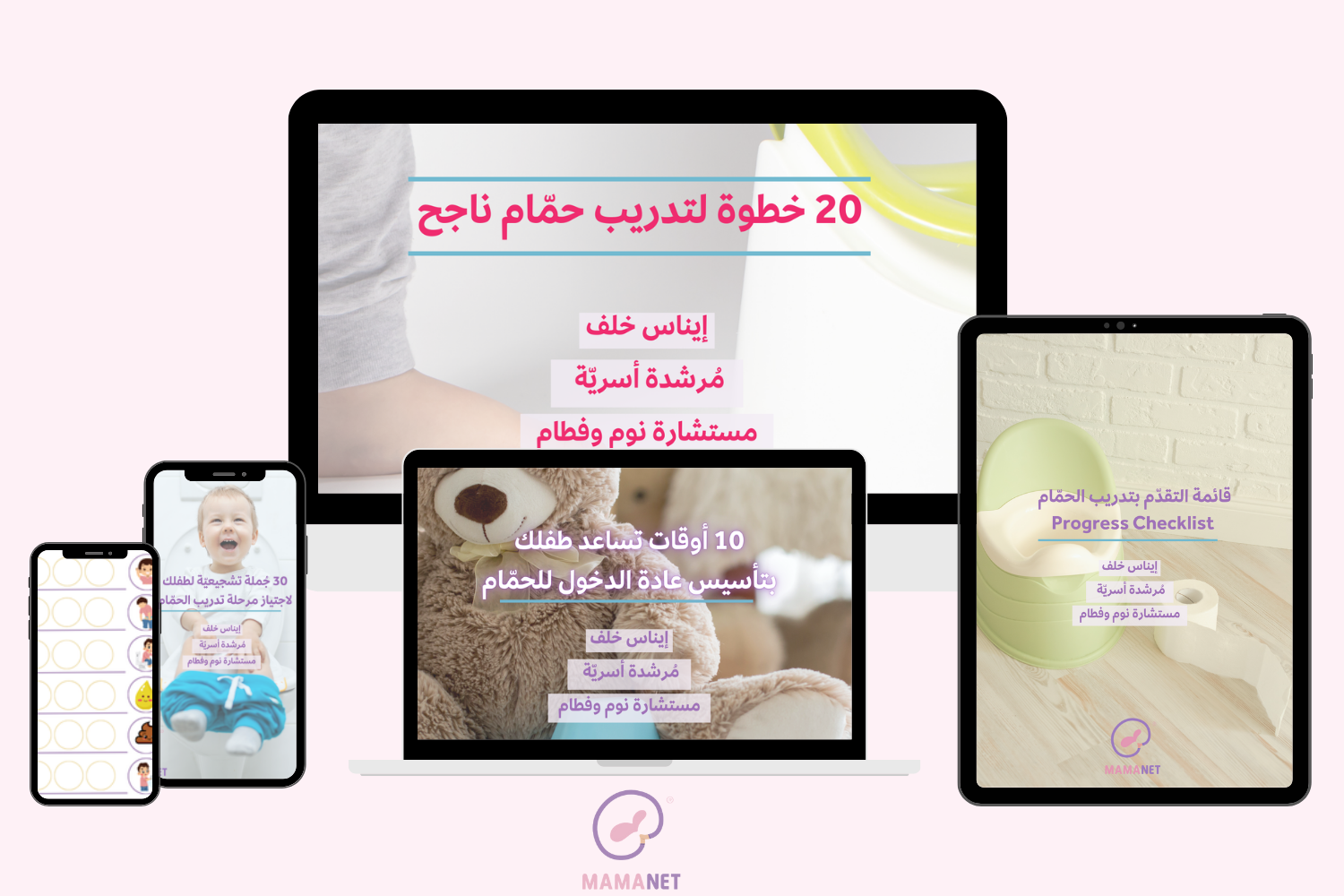 - ملف 20 خطوة لتدريب حمّام ناجح: يحتوي هذا الملف على 20 خطوة تهدف لبدء التدريب وانهاءه بشكل ناجح وبأقل ضغوطات لك ولطفلك.
